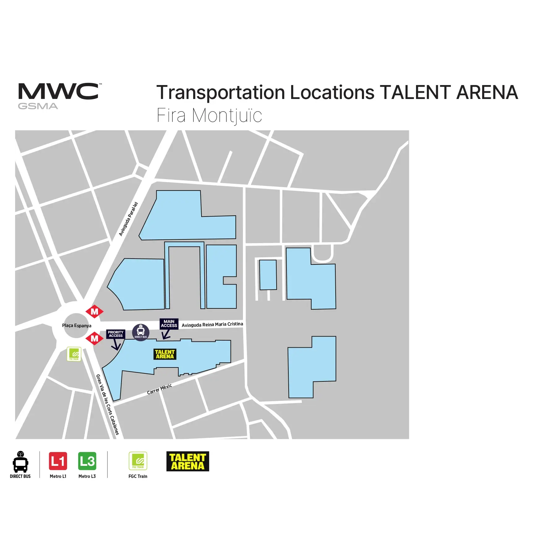 We strongly recommend using Barcelona’s fast and efficient public transport system as the quickest and most convenient way to travel between the city and the venue. To make it even easier, all MWC attendees receive a free transport pass, granting unlimited travel on buses, the Metro, and local FGC trains (Zone 1), including a trip to or from the airport.
